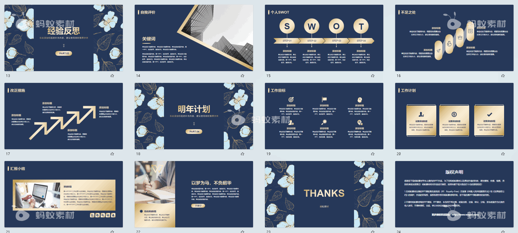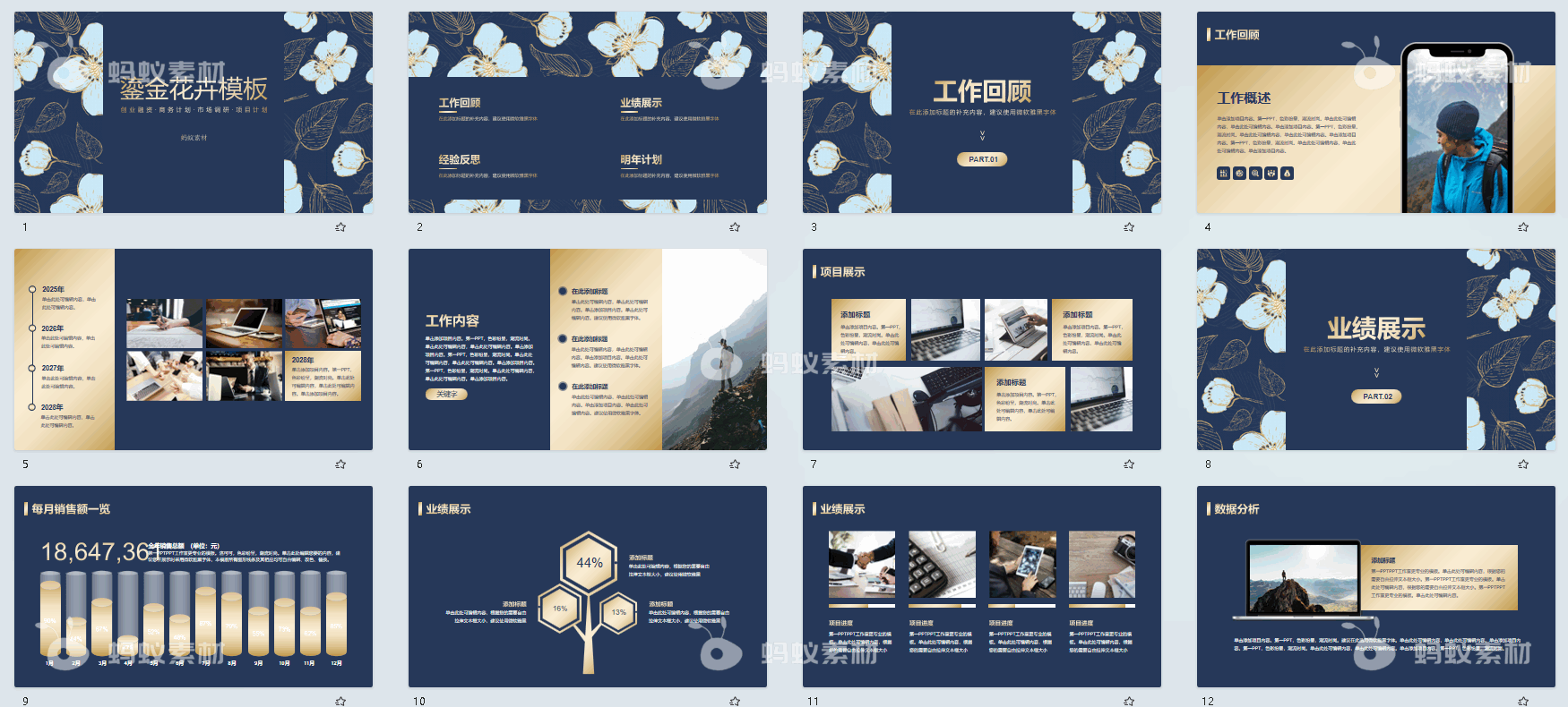 蚂蚁素材提供蓝色精美鎏金花卉背景轻奢商务汇报PPT模板免费下载,当前作品类型是PPT模板,该作品鎏金商务风格设计,使用场景是汇报|报告PPT,也可用于商务计划PPT、商务汇报PPT、鎏金花卉PPT、工作汇报PPT、工作PPT、汇报PPT,作品编号为8hq8Y4,作品格式为pptx / ppt,该PPT模板文件大小是1.90 MB。源文件下载后,文字、图片等主体内容皆可修改,更多真正免费的工作汇报PPT模板下载,就来蚂蚁素材网。
