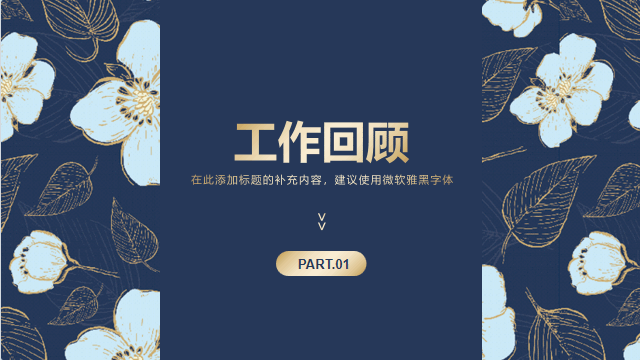 这是一套蓝色精美鎏金花卉背景商务汇报PPT模板,共23页;