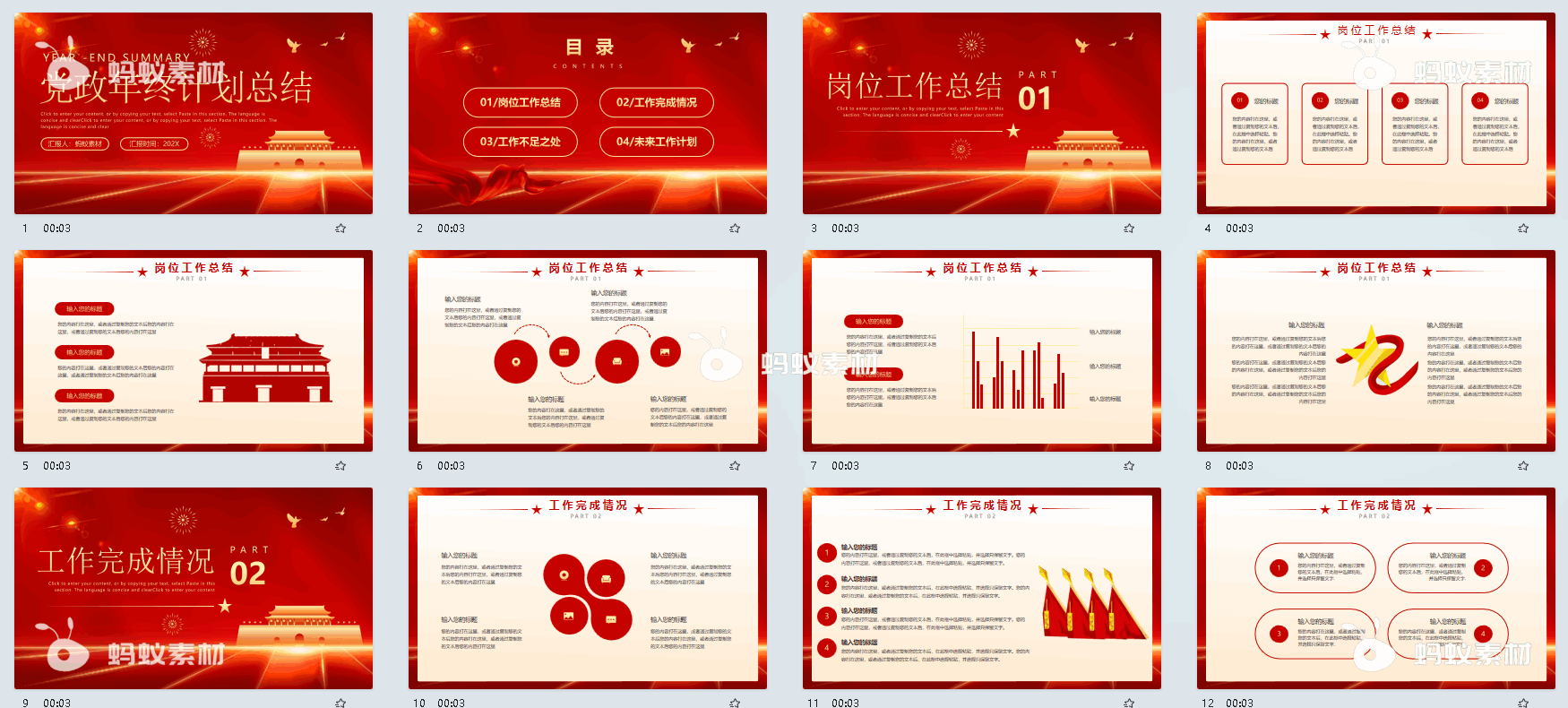 这是一套红色大气党政党建年终总结计划PPT模板,共24页;