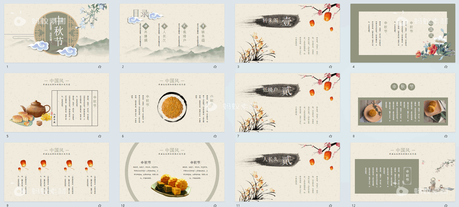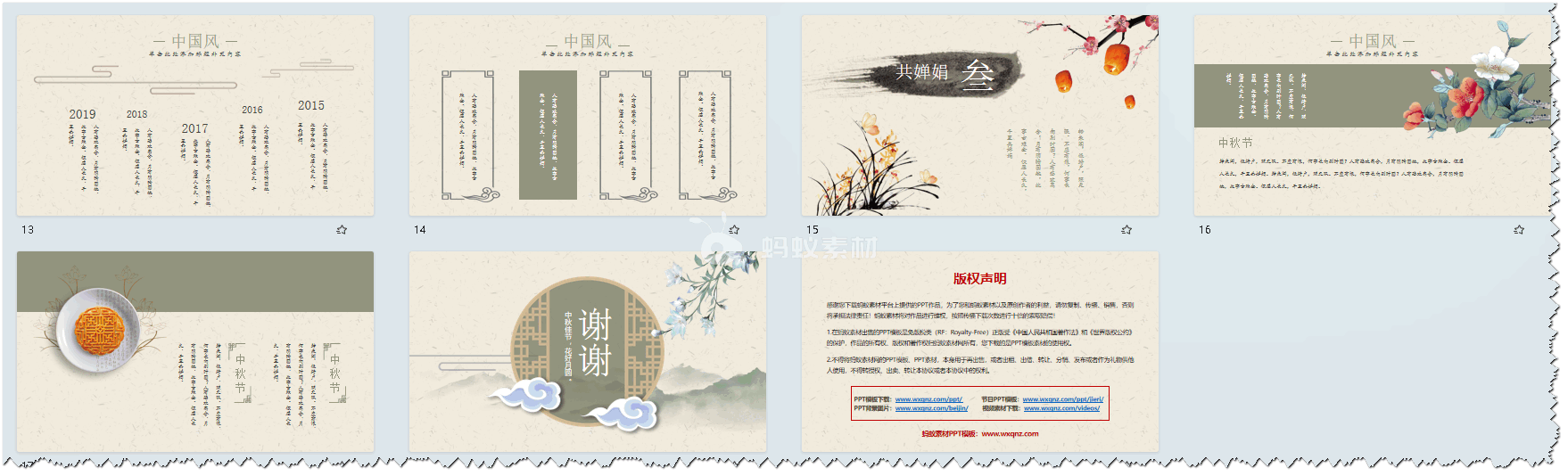 蚂蚁素材提供淡雅中国风中国传统节日中秋节PPT模板免费下载,当前作品类型是PPT模板,该作品中国风风格设计,使用场景是商务PPT模板,也可用于中秋节PPT、中秋PPT、中国风PPT、中国PPT、中国传统节日PPT、节日PPT、传统节日PPT,作品编号为gh5xU2,作品格式为pptx / ppt,该PPT模板文件大小是8.10 MB。源文件下载后,文字、图片等主体内容皆可修改,更多真正免费的商务通用PPT下载,就来蚂蚁素材网。