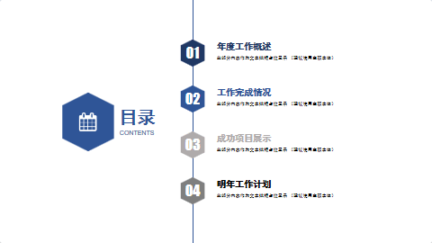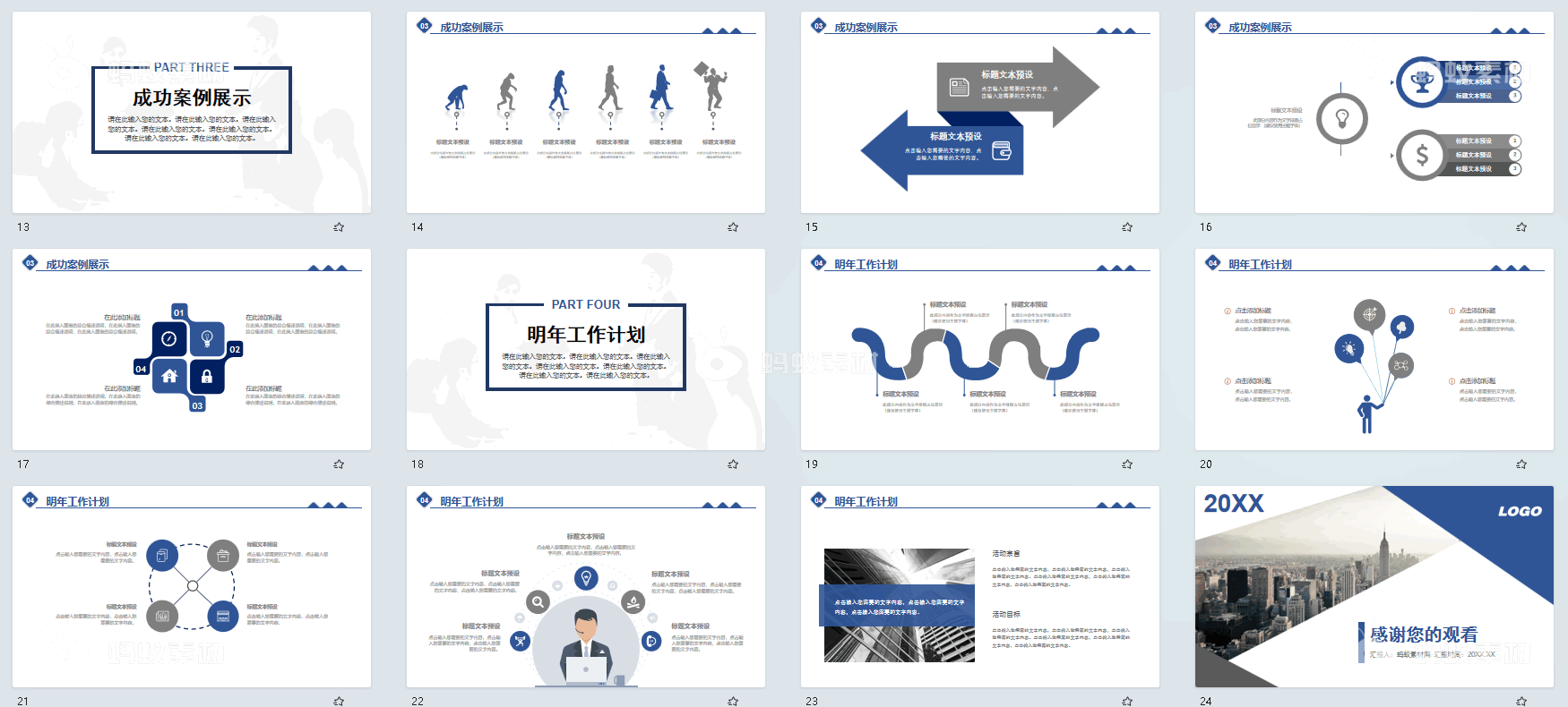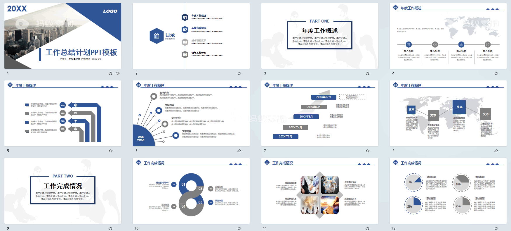 蓝色简约通用工作总结计划目录PPT模板,以蓝色为主色调设计,模板共计24页,简约大气,动态播放,值得下载。