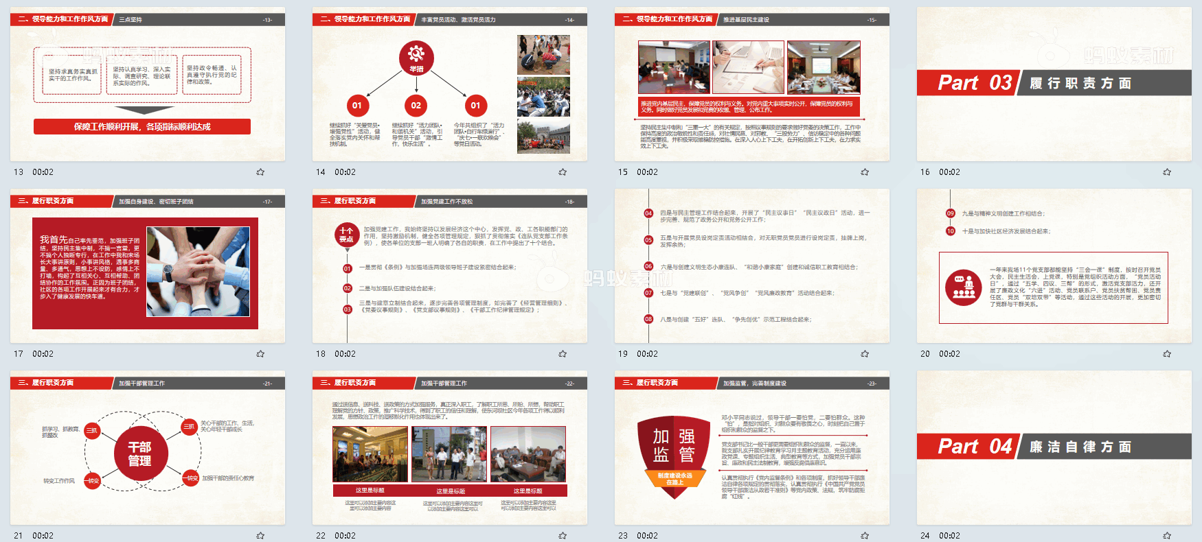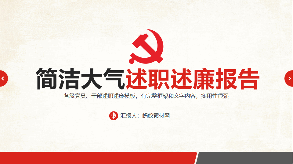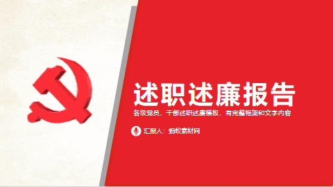 当前作品类型是PPT模板,该作品简约风格设计,以红色为主色调,使用场景是党建汇报|报告PPT,也可用于述职述廉PPT、述职PPT、述廉PPT、报告PPT,作品编号为Z2zpI,作品格式为pptx / ppt,该PPT模板文件大小是4.41 MB。源文件下载后,文字、图片等主体内容皆可修改,更多真正免费的述职报告PPT模板下载,就来蚂蚁素材网。