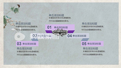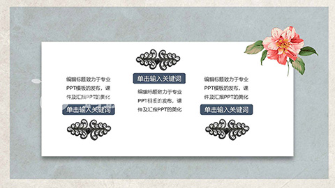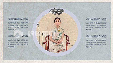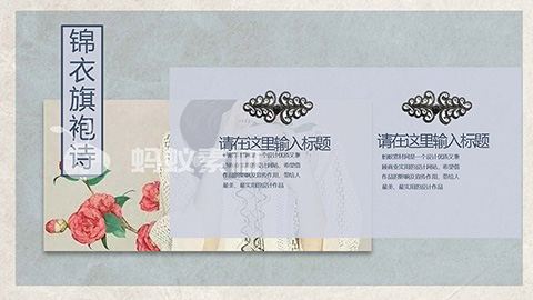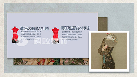 整套PPT模板以古典紫色为主,采用了富有年代感的设计风格。PPT模板封面采用了水彩旗袍背景,搭配紫色花束、叶子形状花纹背景。内容页包含多张精美旗袍写真插图,突出了旗袍文化主题。