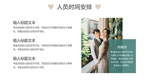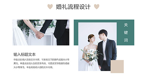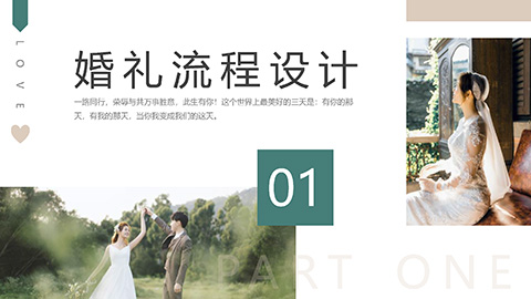 整套PPT模板以绿色为主题色,设计风格唯美浪漫;PPT模板封面使用了婚纱照作为背景图片;内容页包含多张唯美婚纱照插图,婚礼现场场景插图,突出了浪漫爱情婚礼主题。