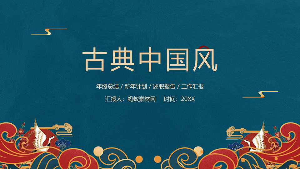 浪花仙鹤背景的古典中国风PPT模板,这是一套浪花仙鹤背景的古典中国风PPT模板,共19页;PPT模板封面,使用了精美浪花、仙鹤图案背景。中间填写商务汇报PPT标题。界面为古典中国风样式。