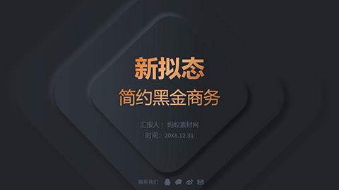 新拟态简约黑金配色商务汇报PPT模板,这是一套新拟态简约黑金配色商务汇报PPT模板,共20页;PPT模板封面,使用了叠加新拟态菱形背景图片。中间填写商务汇报PPT标题。界面为黑金新拟态风格。