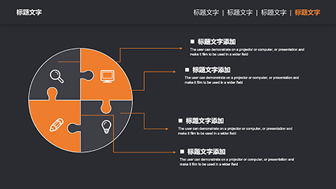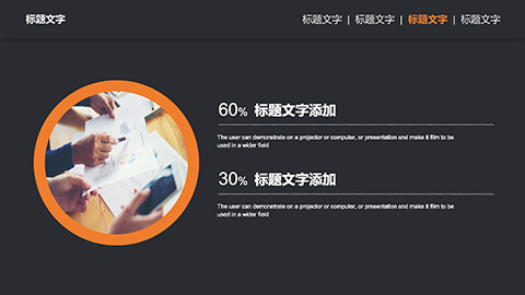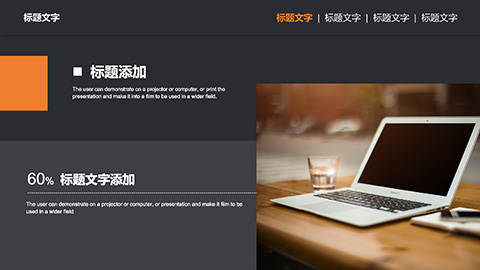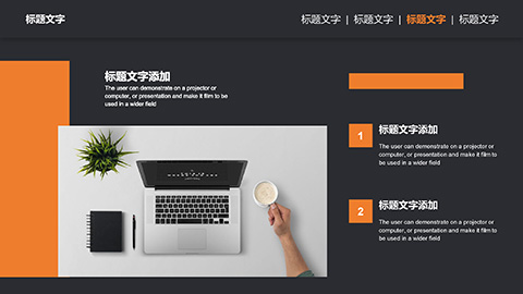 PowerPoint模板内容页,由21张黑橙配色的动态幻灯片图表,搭配PPT文字排版组成。另外使用了白色笔记本电脑插图、整洁办公桌插图、商务会议插图等装饰。