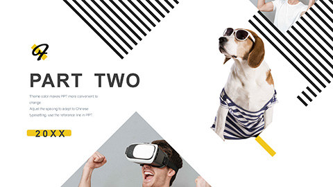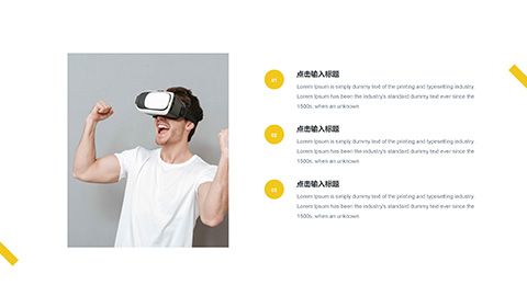 PowerPoint模板内容页,由22张黑橙配色的动态幻灯片图表,搭配PPT文字排版组成。另外使用了戴VR眼镜的青年插图、白色手机插图等装饰。