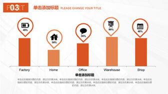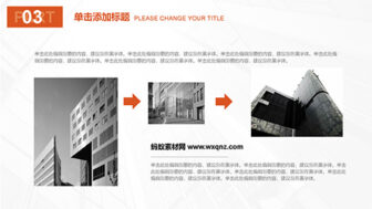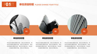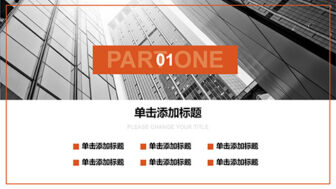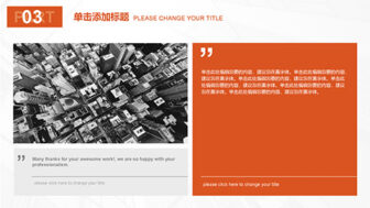 PowerPoint模板内容页,由23张橙色动态幻灯片图表,搭配PPT文字排版组成。另外使用了城市高楼插图、企业办公楼插图等装饰。
