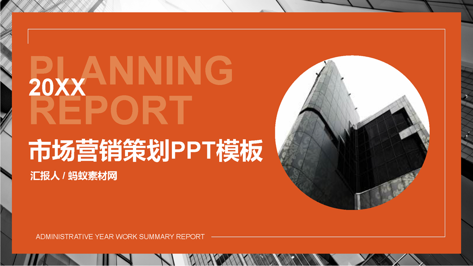 写字楼背景橙色企业市场营销策划PPT模板,这是一套写字楼背景的橙色企业市场营销策划PPT模板,共25页;PPT模板封面,使用了黑白城市写字楼建筑,和橙色卡片背景图片。左侧填写企业市场营销策划PPT标题。界面为橙色简约风格。