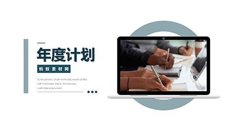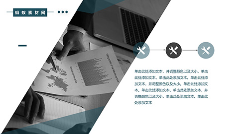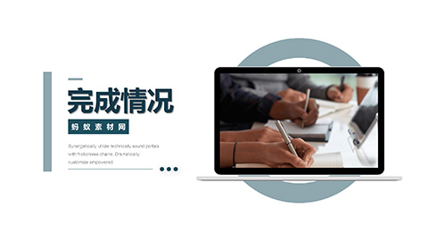 PowerPoint模板内容页,由23张青色动态幻灯片图表,搭配PPT文字排版组成。另外使用了商务笔记本电脑插图、绘制报表的企业员工插图、城市高楼插图等装饰。