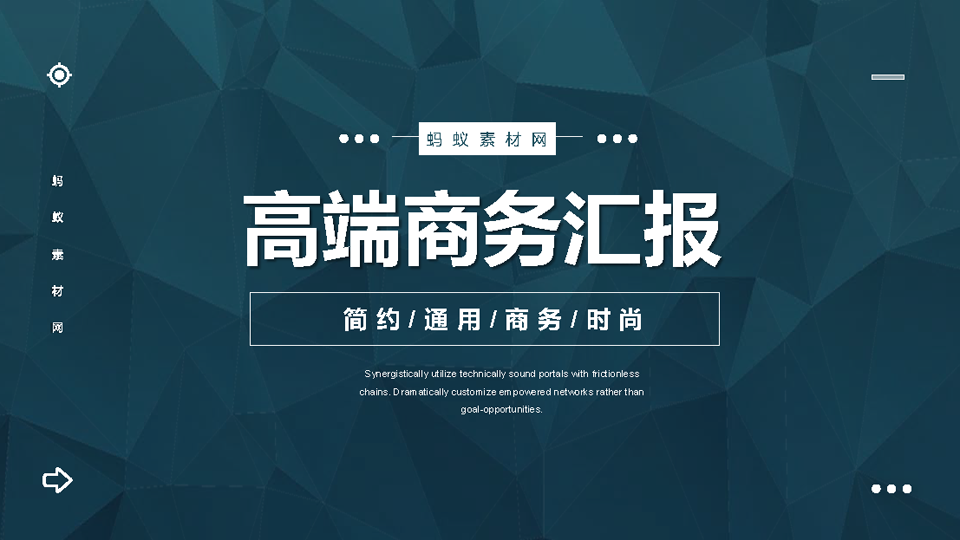 青色低平面多边形背景高端商务汇报PPT模板,这是一套青色低平面多边形背景的高端商务汇报PPT模板,共25页;PPT模板封面,使用了深青低平面多边形背景图片。中间填写商务汇报PPT标题。界面为高端商务风格。