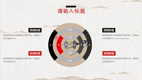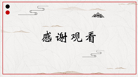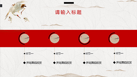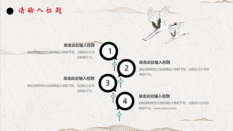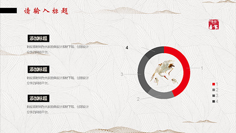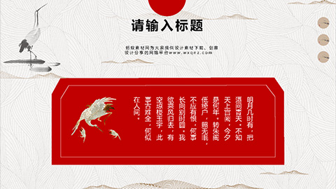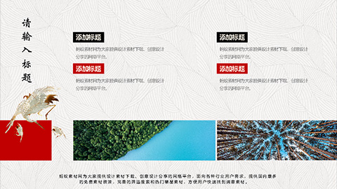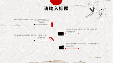 PowerPoint模板内容页,由22张红黑配色的古风动态幻灯片图表,搭配PPT文字排版组成。另外使用了岸边森林插图、白鹤插图等装饰。
