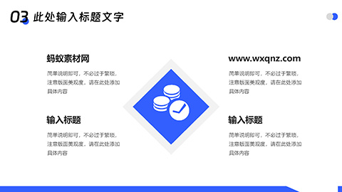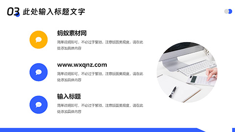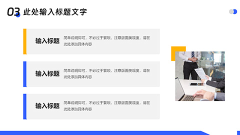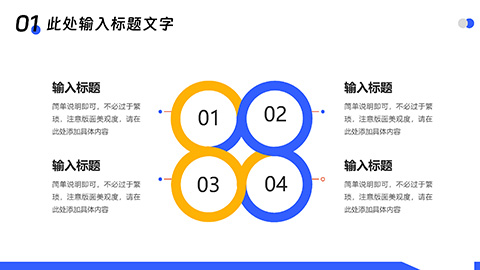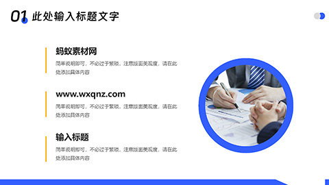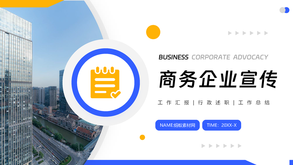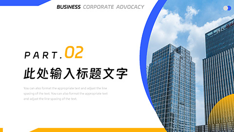 PPT模板封面,使用了商业写字楼建筑背景图片,和蓝橙圆点圆圈装饰。右侧填写商业宣传PPT标题。界面风格简约商务。