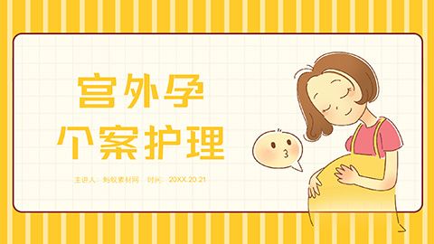 PPT模板封面,使用了黄色条形背景,搭配卡通孕妇背景图片。左侧填写宫外孕个案护理PPT标题,设计风格为精美卡通风格。