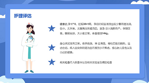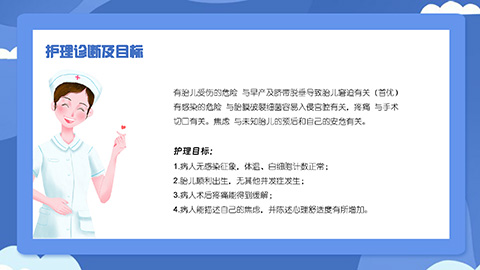 蓝色卡通护士背景胎膜早破病人护理知识讲座PPT模板, 这是一套蓝色卡通护士背景的胎膜早破病人的护理知识讲座PPT模板,共15页;