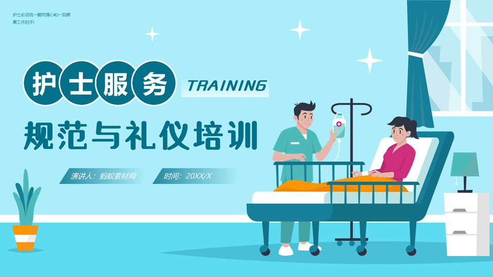 PPT模板封面,使用了医生、病人、病房背景图片。左测填写护士服务规范与礼仪培训PPT标题。界面风格精美卡通。