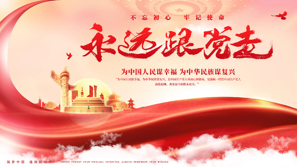 PPT模板封面,使用了红色绸缎背景图片、城市剪影背景图片。右侧填写“永远跟党走”PPT标题,设计风格为红色大气。