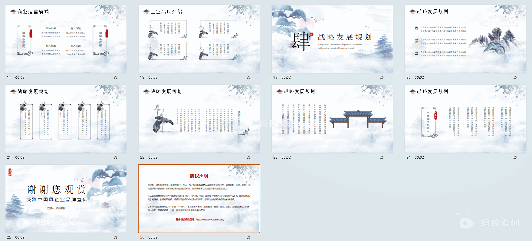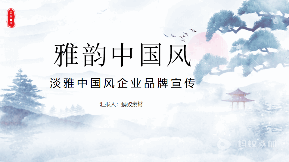 蚂蚁素材提供淡雅红日迎客松背景雅韵中国风品牌宣传PPT模板免费下载,当前作品类型是PPT模板,使用场景是品牌宣传PPT,也可用于淡雅PPT、旅游宣传PPT、旅游PPT、宣传PPT、品牌介绍PPT、中国风PPT,作品编号为hSBKJ0,作品格式为pptx / ppt,该PPT模板文件大小是9.86 MB。源文件下载后,文字、图片等主体内容皆可修改,更多真正免费的旅游宣传PPT模板下载,就来蚂蚁素材网。