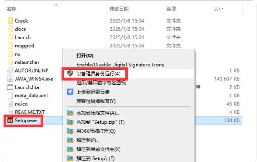 6、回到最开始解压出的文件夹,找到【Setup】程序文件,鼠标右键,选择【以管理员身份运行】。
