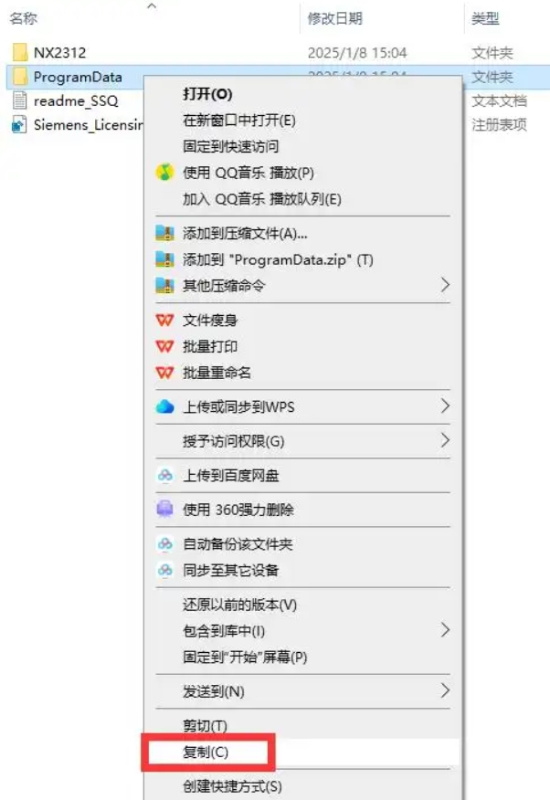 20、回到最开始解压出的文件夹,找到【Crack】文件夹打开,再找到【NX2312】文件夹,鼠标右键,选择【复制】。