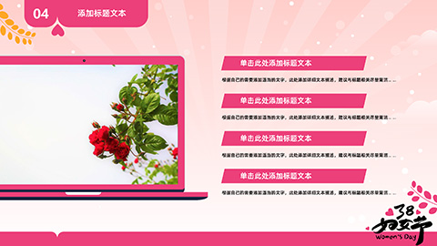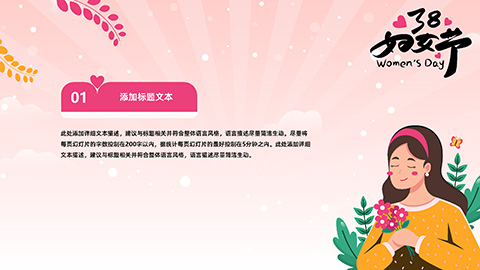 插画风妇女节活动策划PPT模板,本模板共23P,本PPT模板以插画风格为主,专为妇女节活动策划设计,采用渐变暖色背景,搭配光芒、圆点、矢量叶子与爱心元素,营造温馨浪漫氛围。主图为手拿花朵的女性插画,结合手写字体与粉紫配色,展现女性优雅与力量。内含女士剪影及爱的主题配图,适合妇女节活动、女性主题演讲等场景,传递温暖与关怀,彰显节日魅力。