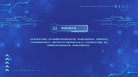 AI赋能未来——简约大气科技风工作汇报PPT模板,本模板共23P,以深邃蓝色为主色调,融入蜂窝状几何图案、电路板线条、箭头、指纹纹理及炫目光效等元素,打造出极具科技感的视觉体验。半透明渐变蓝的配色方案,让每一页都呈现出简约而不失大气的设计风格,为您的汇报增添未来科技的风采。适用于项目汇报、工作总结、年度规划,这款模板都能完美适配,助您传递对科技未来的无限憧憬与专业态度。